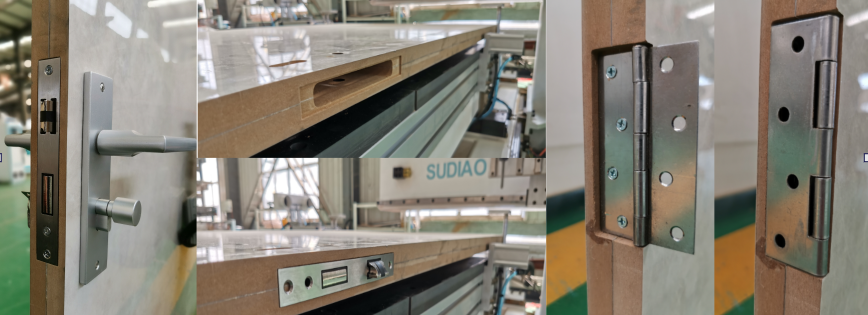 設(shè)備總共7個運功軸,加工鎖孔、鎖階、鎖槽的同時,另一面合頁也同時加工,省時、省力、省流程,顛覆傳統(tǒng)多設(shè)備、多流程配合生產(chǎn)的模式。